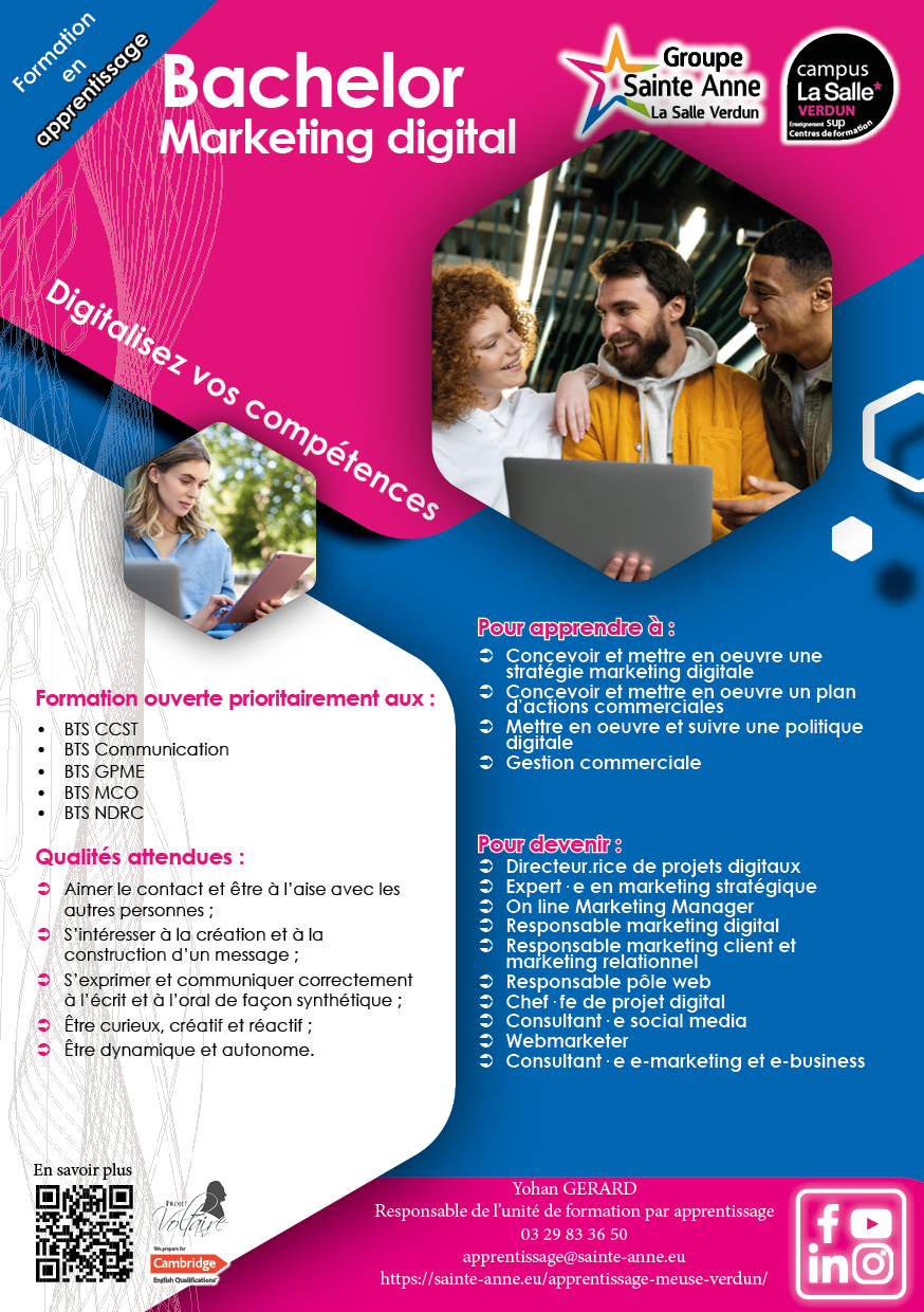 Pour toute demande de renseignements et inscriptions contactez : apprentissage@sainte-anne.eu