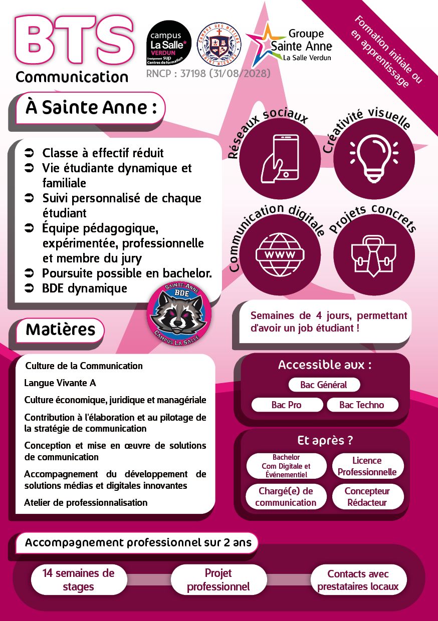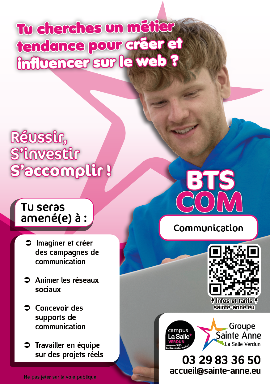 Ce BTS généraliste et polyvalent est idéal pour les personnes créatives tout autant que pour celles qui s’intéressent à la stratégie. Entre réflexion, conception graphique et analyse, les étudiant·e·s développent une aisance écrite et orale nécessaire dans le domaine. La curiosité est la qualité principale pour qui voudrait s’y lancer et ni le travail de groupe ni en autonomie ne doivent le rebuter. L’adaptabilité et la réactivité seront des atouts importants pour tout·e communicant·e !