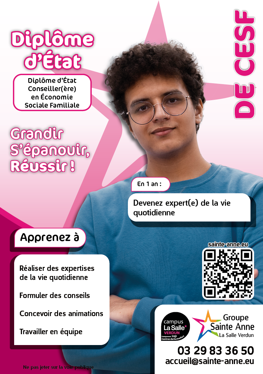 Le diplôme d’État CESF est équivalent à un niveau licence et partage un socle commun avec les autres DE du travail social. Celui-ci en particulier responsabilise les étudiant·e·s et les forme à l’organisation de toute action d’éducation du quotidien dans les domaines de la santé, de l’alimentation, de l’habillement et de la vie quotidienne sous tous ses aspects.